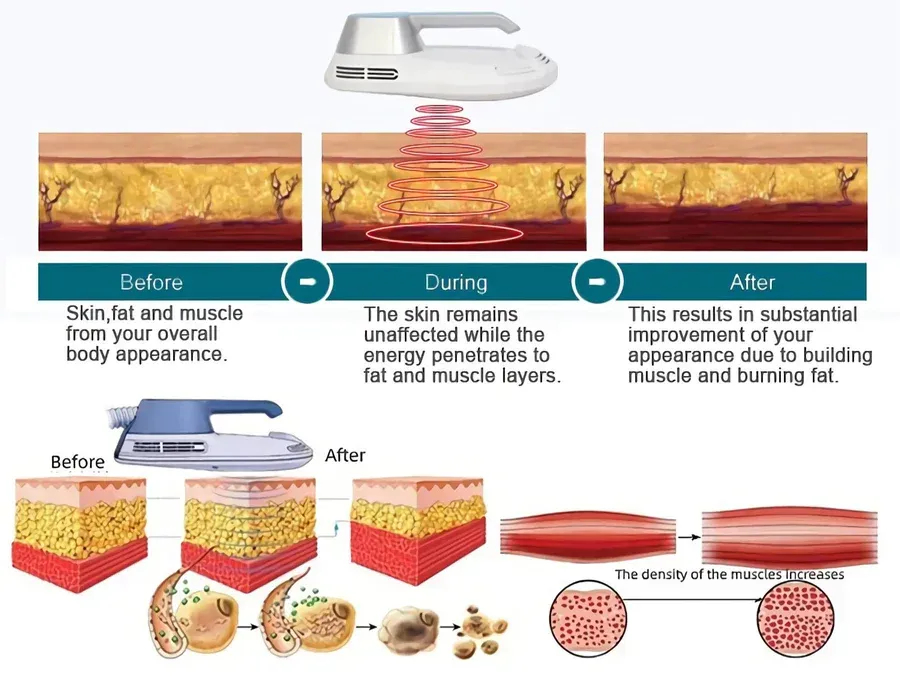 EMSZero doesn’t stop at muscle building—it also targets fat. As muscles contract at this high intensity, the process creates a thermal effect in surrounding tissues. This triggers lipolysis, breaking down stored fat cells and releasing fatty acids into the body’s natural metabolic system, where they are processed and eliminated.